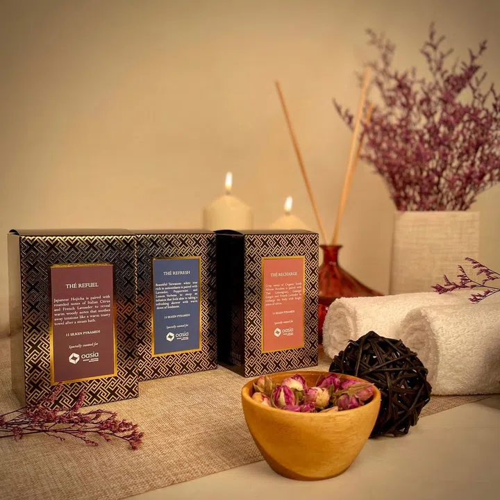 He shares, “Thé Refresh uses a Taiwanese white tea with lemon verbena and peppermint to create a refreshing blend. Thé Recharge features an organic green rooibos with Thai lemongrass and galangal ginger to recharge the body with bright notes of citrus. Thé Refuel contains Japanese hojicha with lavender and eucalyptus to reveal warm woody notes to soothe away tensions.”