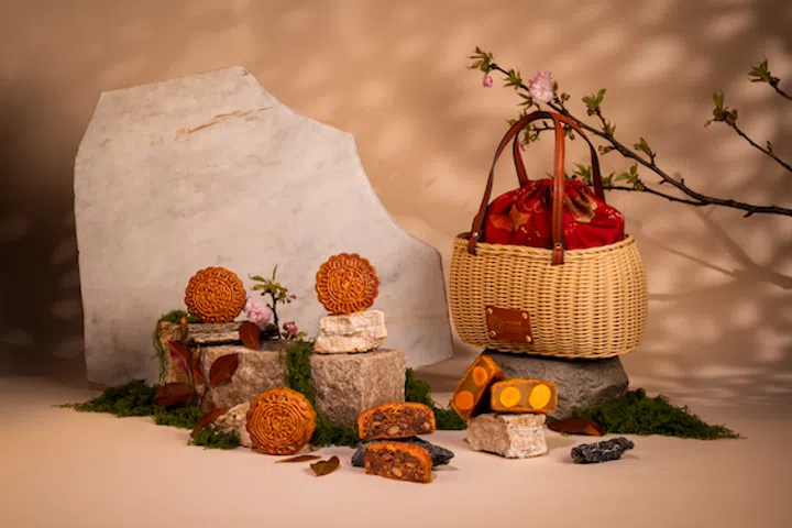 A set of four mooncakes are presented in a woven rattan handbag with a removable drawstring pouch, offering a reusable, stylish accessory along with Mid-autumn treats.