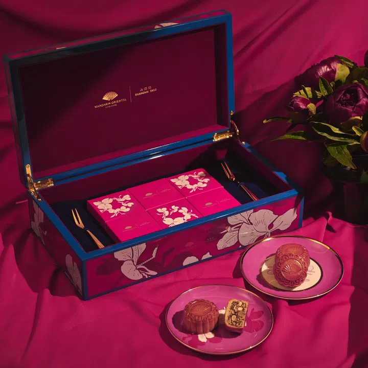 Mandarin Oriental partners with SHANGHAI TANG this year for a gift set that doubles as a keepsake. Six mini baked mooncakes are housed in a vivid fuchsia case, reminiscent of the brand’s jewellery boxes.
