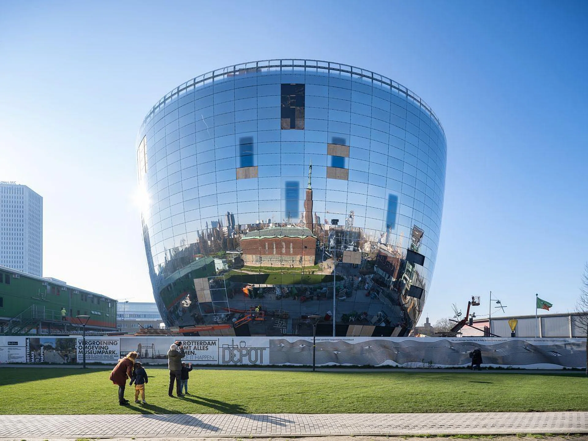 The ovoid, top-heavy structure is a reflection of the museum’s self-described “utterly democratic” nature. Its covered by 1,664 mirrored panels that serve to reflect everything around it - passers-by, the rest of Museumpark and Rotterdam itself. The 15,000 sqm building blends almost mirage-like into the surrounding architecture, and the design of the structure leaves plenty of room for nearby footpaths and greenery.