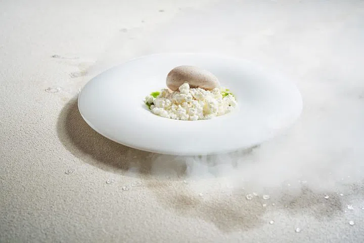 Dessert is also where Han shines. Instead of the usual chocolate and vanilla creations, Han crafts compelling flavours using typical korean ingredients. An unlikely bingsu-inspired combination of mascarpone snow, makgeolli sorbet, and watermelon, rock melon, and peaches fermented in grape juice and mint oil brings all sorts of pleasing mildness.