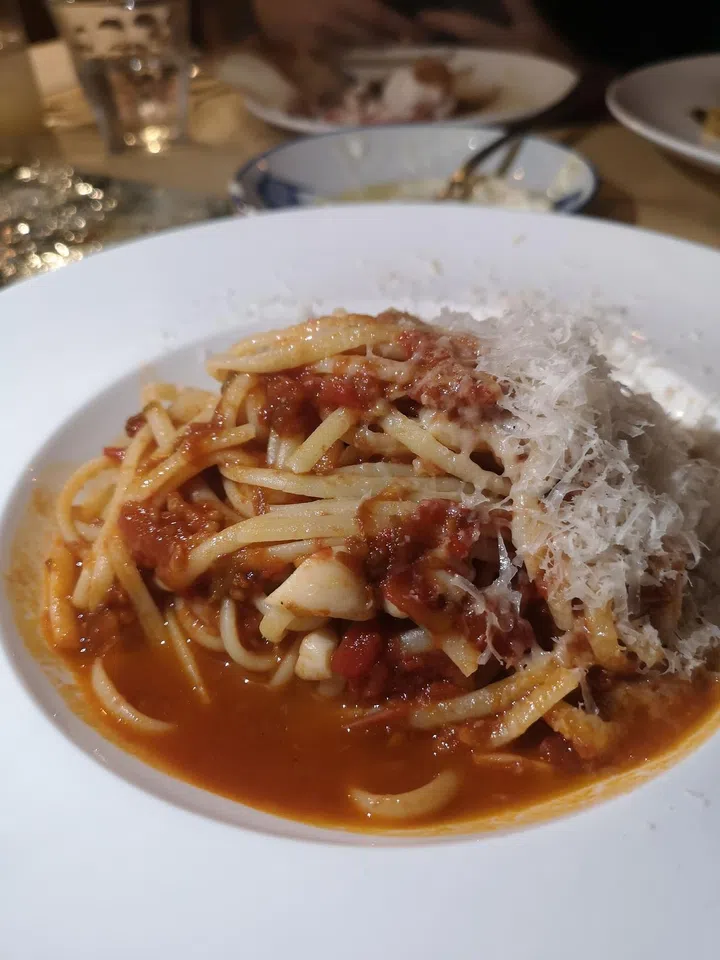 Two of the best dishes we tried had tomatoes as their main component: the Our world famous tomato pasta and Naked heirloom tomatoes mosaic. The latter comprises thin slices of the fruit on a slab of marble that’s simply seasoned, and the former is Shani’s go-to meal made with hand-squeezed Maggie tomato juice and garlic.