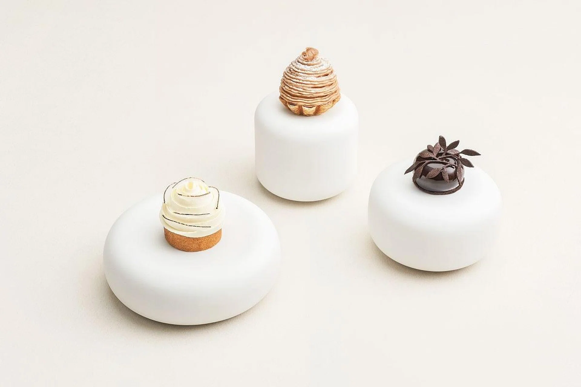 The box contains three bijou treats inspired by the exacting artisanship and indulgence of French entremets, a meticulous construction typically involving multiple layers of sponge, mousse, cremeux and glazes.