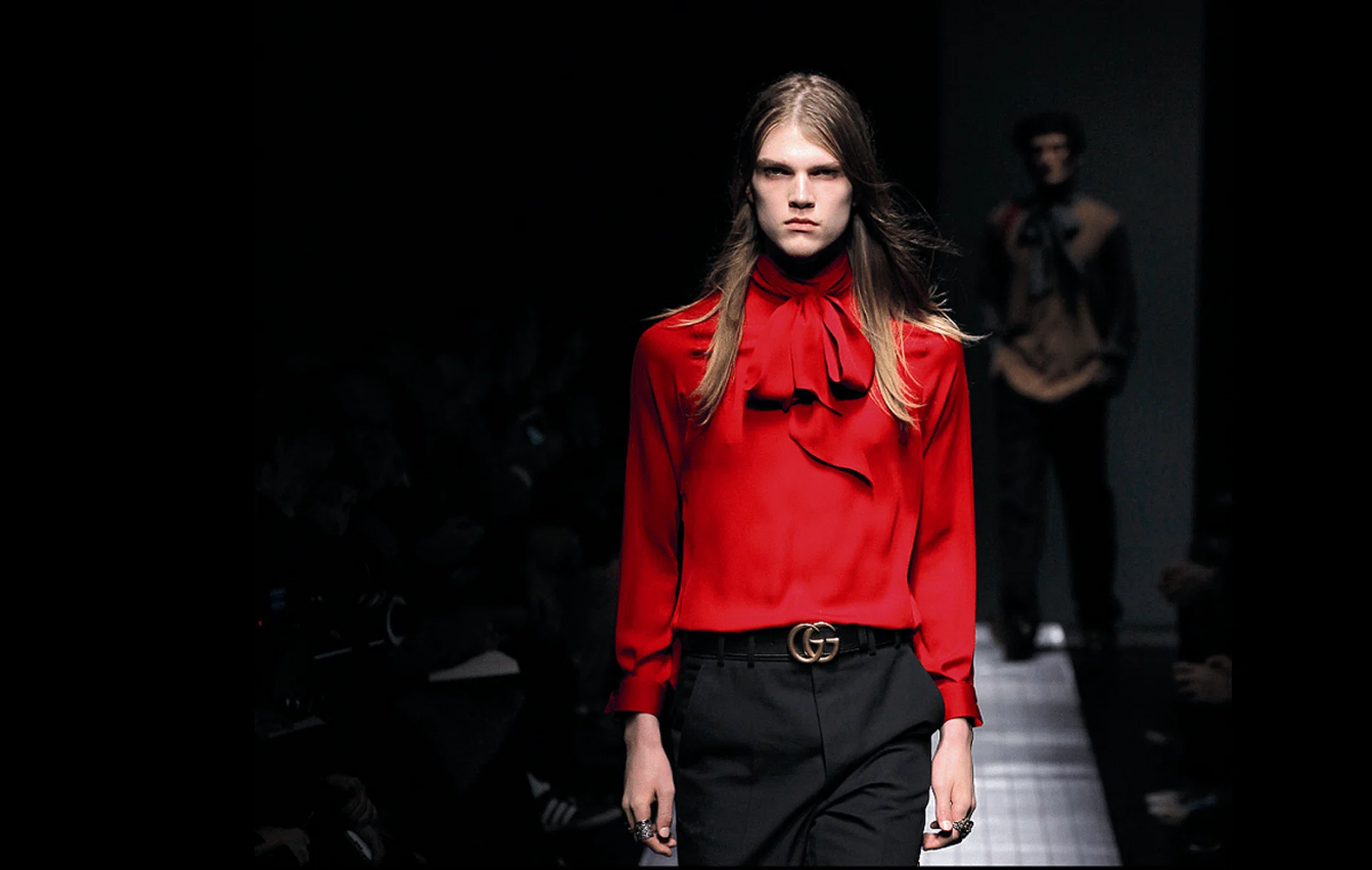 The proof is in the clothing – Gucci’s autumn 2015 menswear runway show featured both male and female models in ladylike chiff on blouses, tight sweaters and slacks, a marked departure from its hitherto flamboyant, but nowhere near feminine, aesthetic. The gender divide was also fuzzy over at Prada, which showed its autumn 2015 menswear collection together with its women’s pre-autumn collection, with models strutting down the runway in standard-issue shortsleeved shirts and black lab coats.