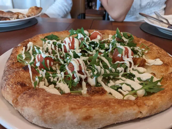 Encircling the pizza crust is a puffy and airy cornicione that has been baked brown evenly in the woodfired oven with California almond wood, which is known for its fruit-forward wood flavour.