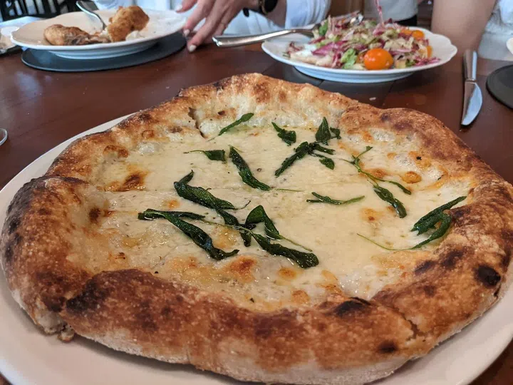 Another lean pizza is the Bianca, which has a blend of creamy fontina, mozzarella, truffle-scented sottocenere cheese, which has been aged beneath a layer of ash. The blend of these cheese yield a mix of saltiness, honeyed sweetness and butteriness, coupled with fragrance emanating from the leaves of fried sage.