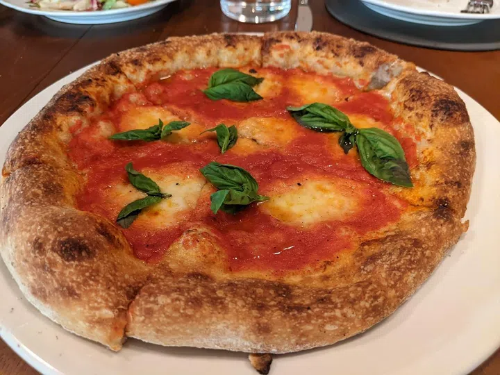 The beauty of the crust is amplified through the leaner pizzas such as Margherita, which beams with mellow sweetness from the tomato paste, splotches of mozzarella di bufala and a sprinkling of basil leaves.