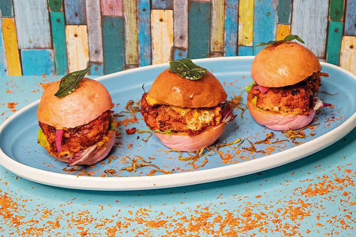 Chef Manjunath Mural, who now runs the more casual neo-Indian street food restaurant Adda after departing Michelin-starred Song of India, says his plant-based chicken dishes have earned a loyal set of customers. He uses TiNDLE nuggets and burgers made from soya and wheat proteins for his desi-tacos, Bollywood burger sliders, and makhani pot pie.