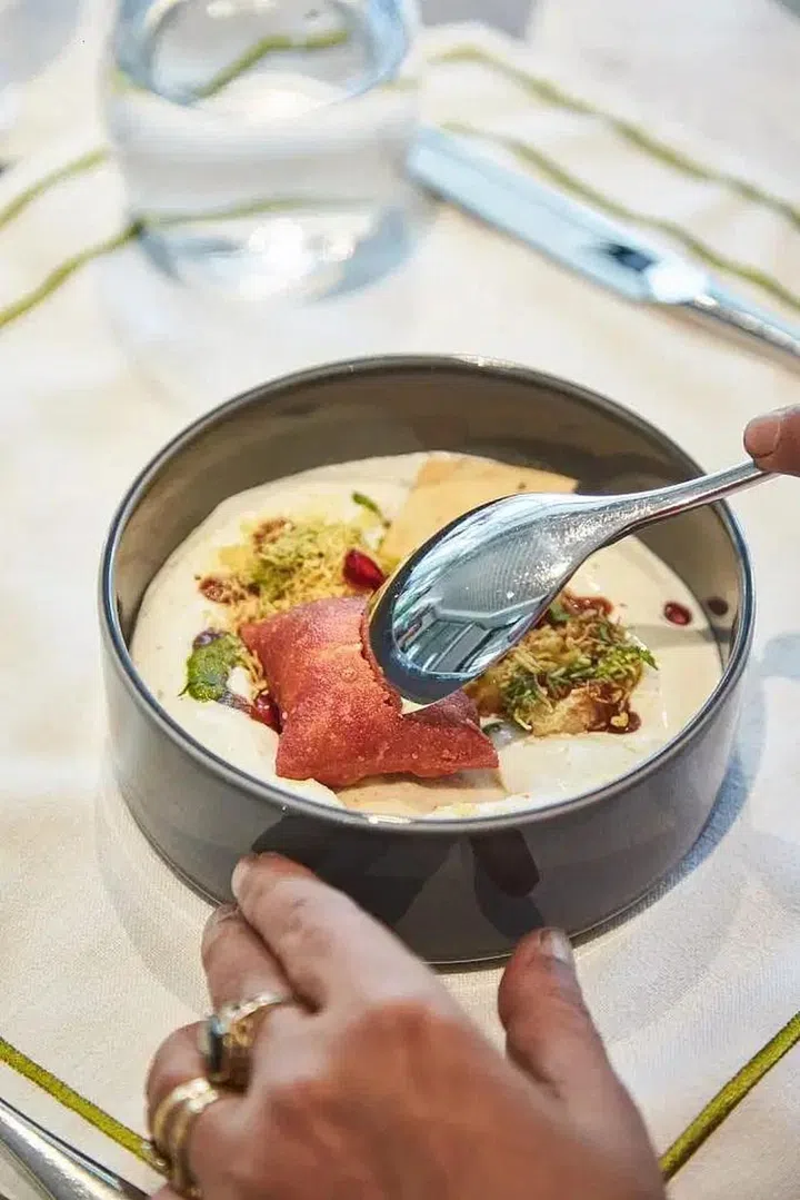 She walks us through the rich and colourful stories behind her collaboration with Yantra, starting with the Chaat Banarasi. A visually striking combination of potatoes, chana chaat (cooked chickpeas with fresh onions, tomatoes, tamarind chutney), pomegranate, housemade chutneys and crisps, the dish is set against a white canvas of aerated yoghurt.