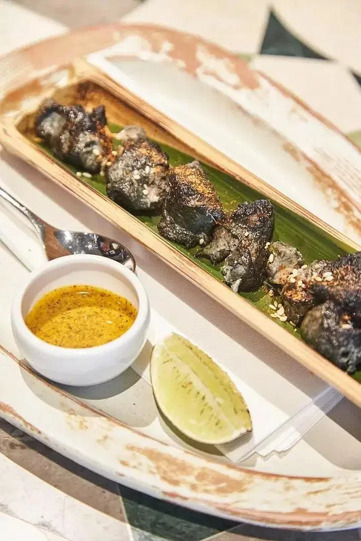 Another intriguing item, the aromatic Kong Shop Chicken is bamboo-skewered, marinated in black sesame paste, and cooked on a binchotan. Pritha kept this recipe from a time when she visited the Khasi tribe in the hilly northeastern state of Meghalaya. The creation is inspired by ‘kong shops’, quintessential eating houses run by the tribe’s women. Kong means ‘auntie’ in Khasi, a language spoken by about 900,000 living in the region.
