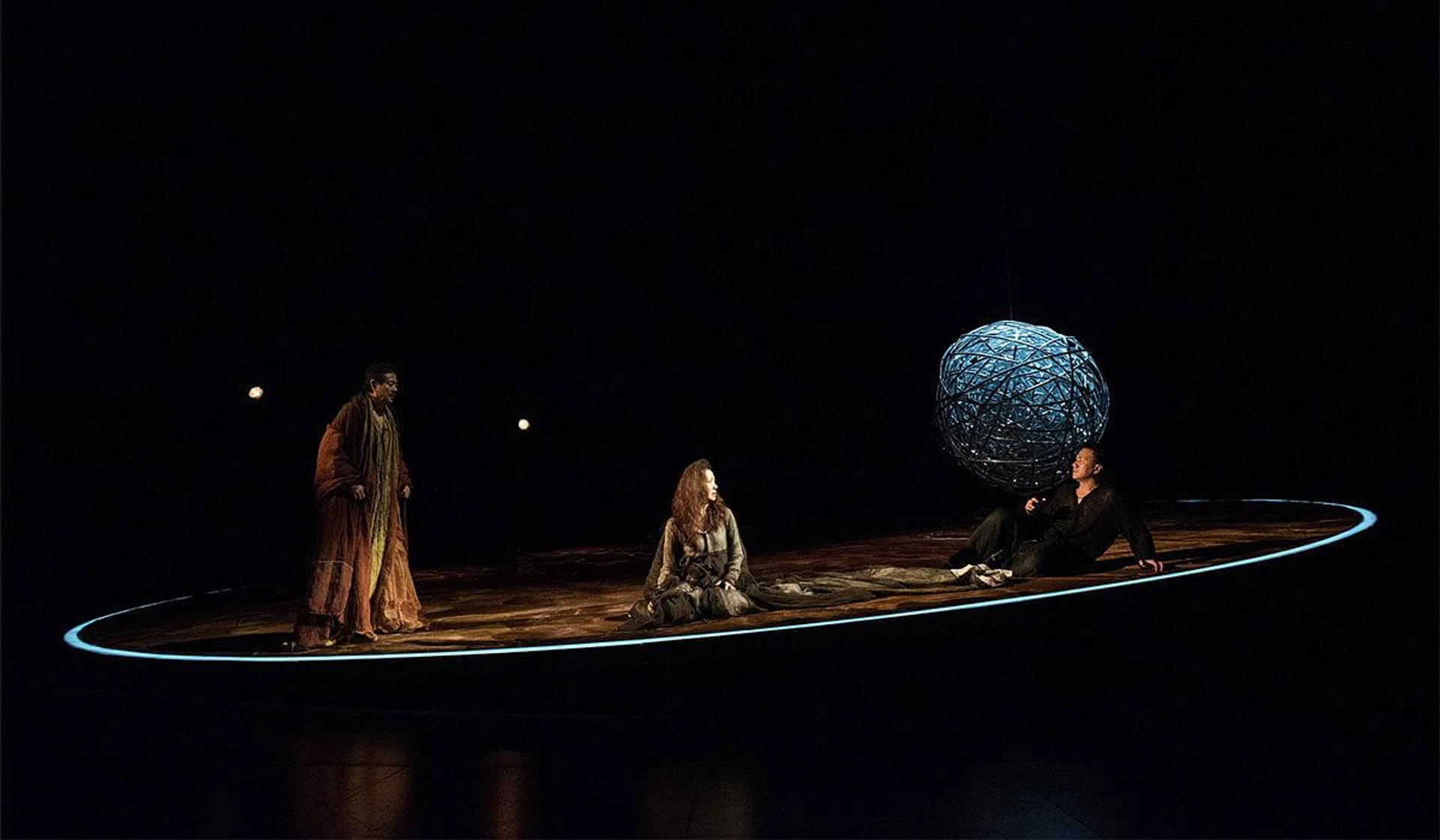 Michael Simon's stunning set, with arresting, almost cosmic lighting by Deng Wen, turns and tilts ominously, conveying the "out of joint" atmosphere of a Denmark deranged.