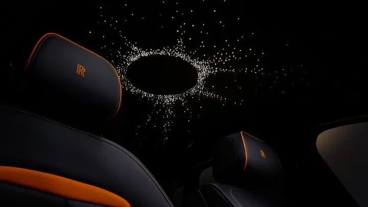 The celestial phenomenon takes centre stage once again in a fully bespoke Starlight Headliner, where most of an array of 1,132 lights are used to create a bright corona around a lunar silhouette.