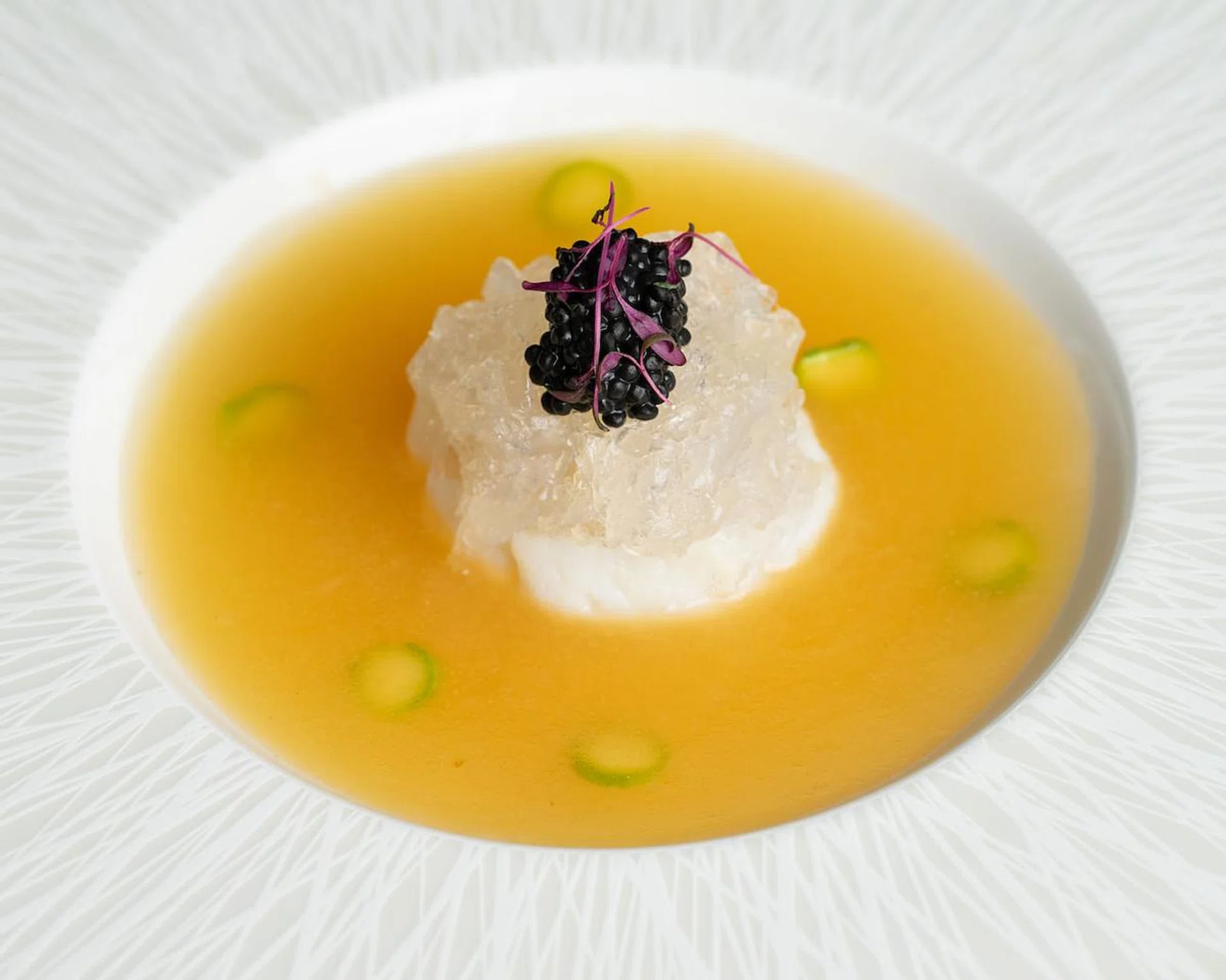 The next two courses of Braised Scallop Dumpling filled with Bird’s Nest, Caviar and Bamboo Fungus in Supreme Broth and Poached Soon Hock Fillet and Green Bean Sheet in Thick Fish Broth are the embodiment of Cantonese cuisine done right.