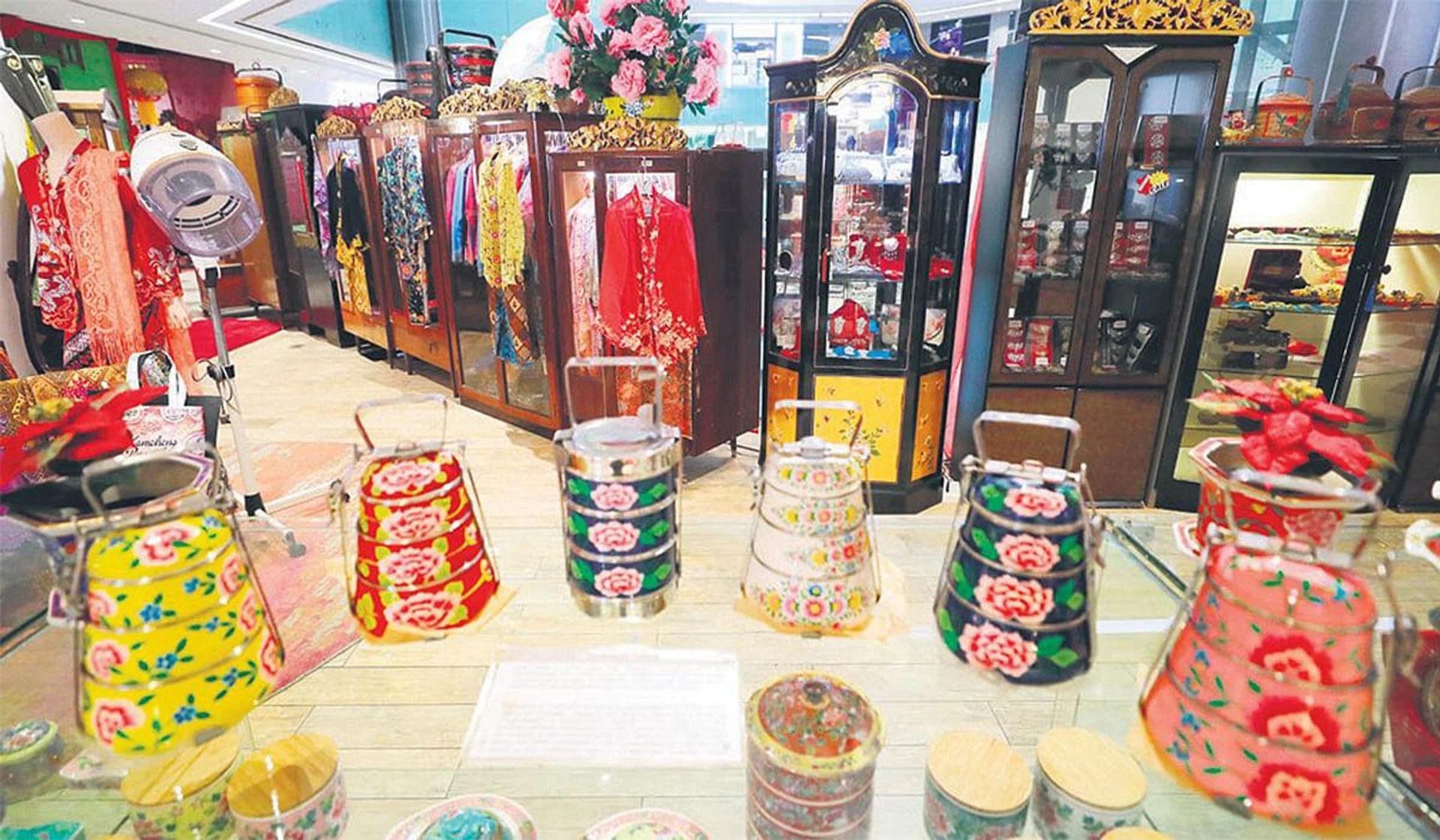 other artefacts such as tiffin carriers and enamel chamber pots. Mr Khoo has also set up a small retail area outside the restaurant selling kebayas, brooches and beaded slippers.