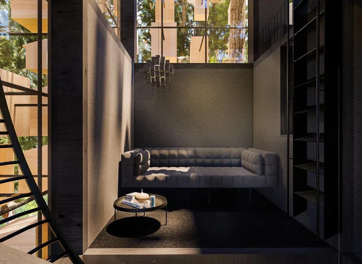 Said birdhouses are arranged around the glass-walled hotel room to provide ample privacy while allowing plenty of natural light to stream into the woody interior, which is split into a lower living area and an upper sleeping level.