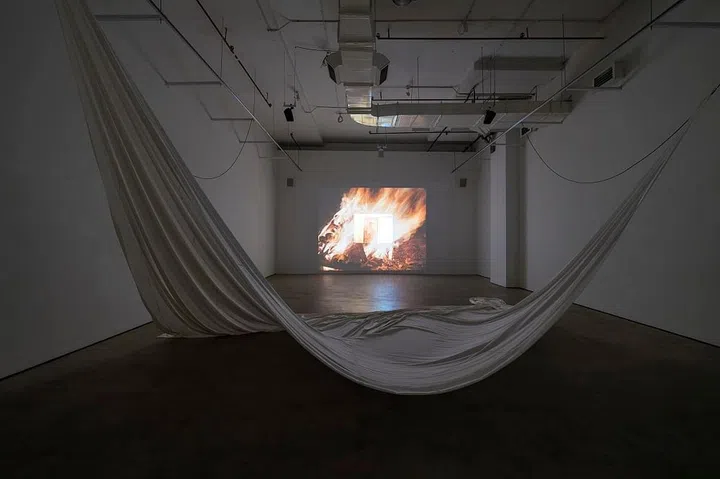 The footage is ingeniously displayed with a large, mobile curtain backdrop mechanised by Thai visual design studio DuckUnit. This distinctive use of the fabric-curtain-backdrop is a recurring motif in Weerasethakul's work, seen in his past projects such as “Fever Room” (2015) and “Constellations” (2018). In this latest installation, the curtains are not just static displays but mobile elements that interact with the video, adding a layer of theatricality and mystery.