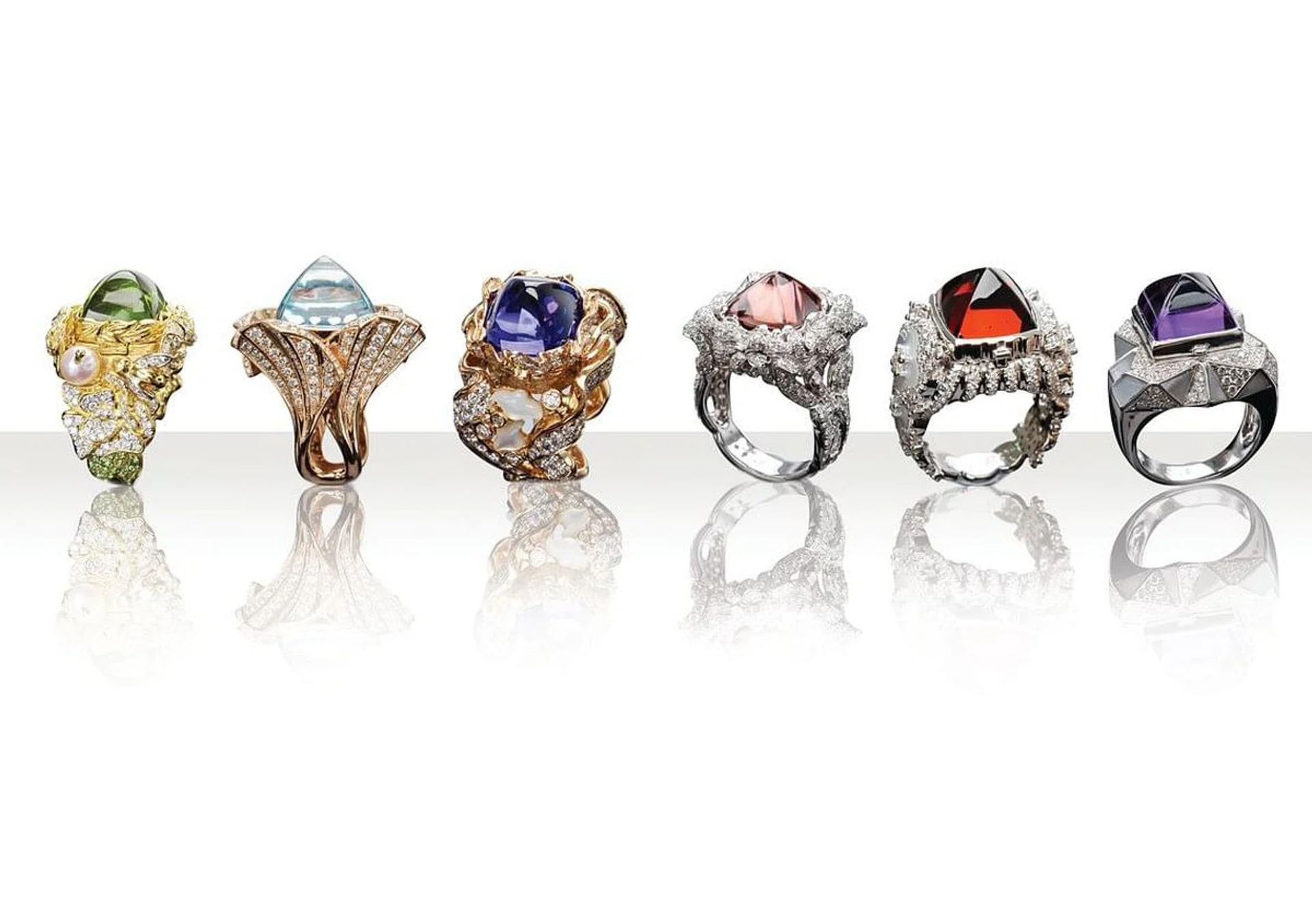 The two designers started brainstorming mid-last year. Ng wanted to use the uncommon sugarloaf cut on the gemstones to ensure they stand out. Pomeroy deliberated on the colours of the gemstones that would represent each building: “We picked the Malaya garnet for the Palace of Westminster. Whenever the sun rises or sets, it would be a beautiful, deep russet red, and I wanted to capture that essence.” A stunning 10.65 stone sits at the centre of the Neo-Gothic-inspired ring.