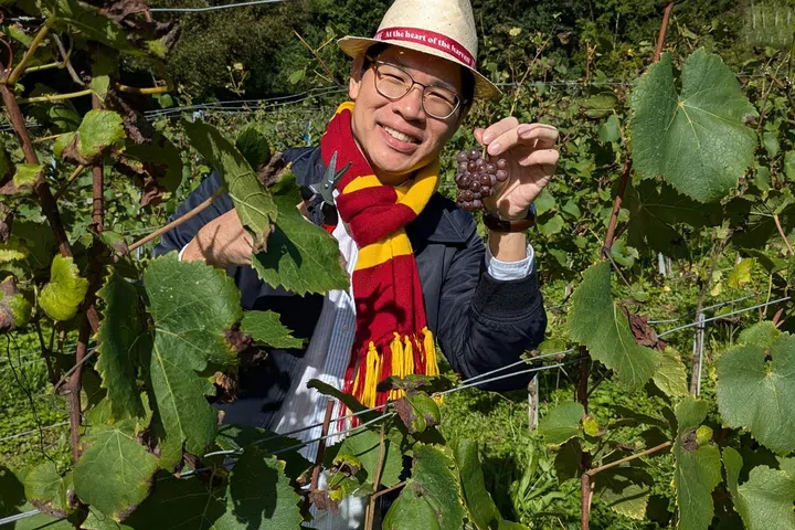 The writer harvesting grapes in the Cave Guillod vineyard. (Photo: Kenneth SZ Goh)