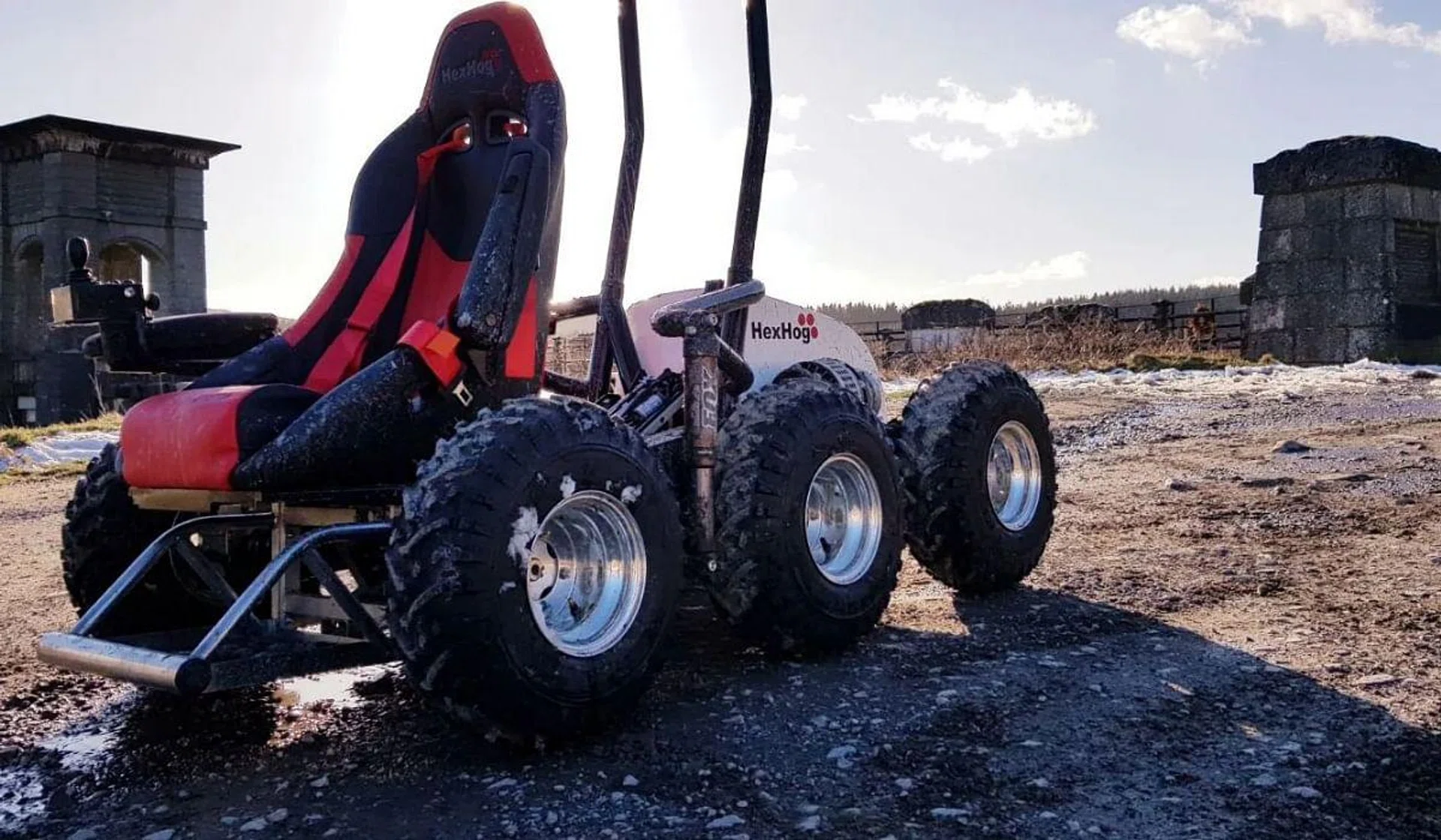 Instead of maneuvering off-road while wrestling two-handed with a set of handlebars - all the while receiving intense tactile feedback from whatever dune or butte you’re currently ascending - the Hex Hog can be steered via a simple one-handed joystick system that can be calibrated to your level of comfort.