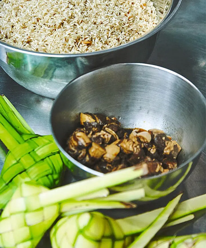 Marinated pork and seasoned rice waiting to go into the leaf wrappings
