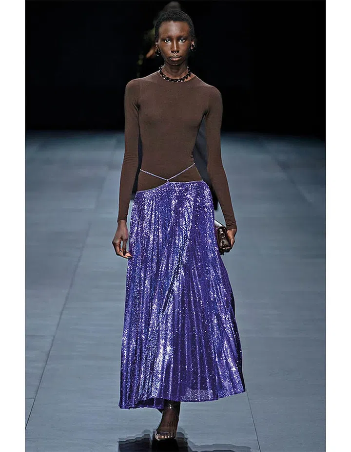 In a sharp collection dominated by black and white, Alexander McQueen creative director Sarah Burton used dashes of powdery mauve and blue to create monochromatic tailoring that stood out with an elegant whisper. At women’s collections, vibrant, love-it-or-hate-it violet was used to create looks as bold as they were elegant: These included the elaborately embellished frocks at Giorgio Armani as well as a sparkly pleated skirt at Valentino.
