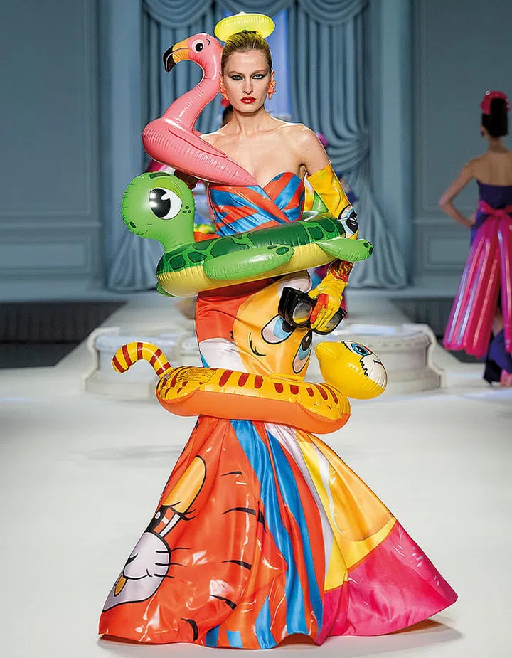 Aside from adding inflatable lapels to jackets and flotation devices to cocktail dresses, he also used colourful pool floats to complement a draped dress printed all over with cartoon animals.