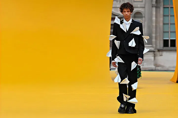 At Louis Vuitton’s men’s show, the design team paid tribute to the power of imagination and the different ways in which we realise our ideas as we move from childhood to adulthood. As part of the theme of childhood, models wore folded “paper” hats that were made from leather and a formal coat was decked out with leather “paper” planes.