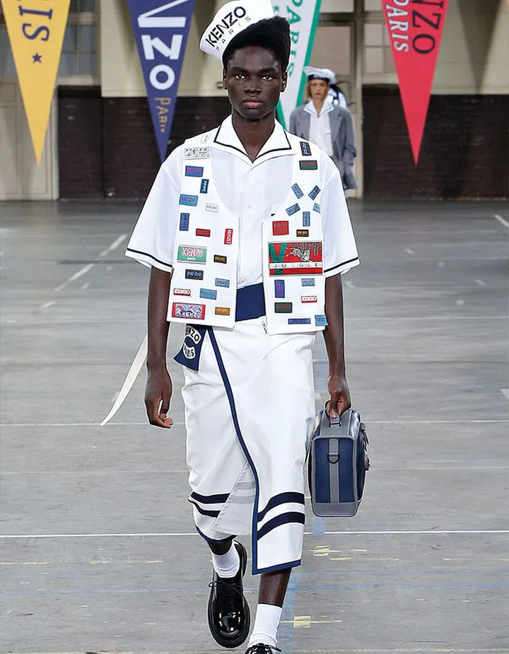 Our favourite takes on the neckwear were shown at Kenzo’s co-ed collection. Creative director and streetwear icon Nigo was inspired by what is known as the DC Brand Boom of 1980s Japan, where the country’s fashion scene was populated by “pop-driven” labels with a penchant for “cartoonish animal motifs” as well as the now- legendary Japanese designers presenting in Paris (think Rei Kawakubo of Comme des Garcons, Yohji Yamamoto and of course, Kenzo Takada).