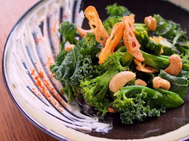 Menu highlights include butternut squash fettuccine with tom yam broth, shimeji, baby corn, coriander oil and Japanese cucumber ribbons ($16); grilled cauliflower with satay sauce, vermicelli and achar ($16); and king oyster "scallops" with spinach puree, baby carrot, baby corn and toasted hazelnuts ($12). Desserts include matcha ice cream with blood orange puree, poached plums and pistachios ($8). A set lunch comprises one main and one cold-pressed juice at $18, with a three-course meal that includes a dessert at $28.