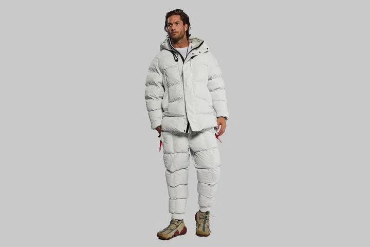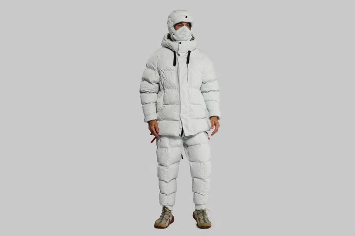 Steve and Nick Tidball are looking a little farther with their recently revealed Titan puffer jacket (sold with matching hat and pants). The range is named Titan, Saturn’s largest moon and the only other body in our solar system that’s known to have liquid bodies on its surface and a thick nitrogen-rich atmosphere.