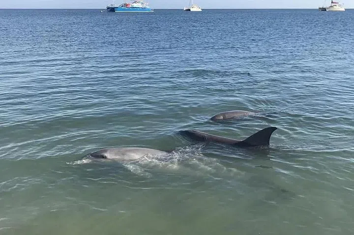 A few mature females are selected and fed fresh local fish by volunteers under strict guidelines every morning, as visitors line the beach, up to their calves in the water, for the chance to get close and maybe feed one of the dolphins themselves.