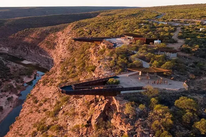 I can see red prehistoric rocks and silver-green vegetation below through the steel mesh of the Kalbarri Skywalk, a boomerang-shaped structure that opened in June 2020. The modern rust-and-silver structure, through a clever mix of material and design, is both futuristic and reflective of the surrounding rock formations, which are 400 million years old.