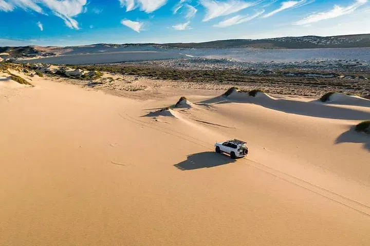 From the Eco Lodge, we take a four-wheel-drive tour across the island's unpaved tracks, over towering sand dunes and coastal heath of spinifex, wax plants and saltbush, to see the swells smashing into the rocks at Surf Point. Every few minutes, a wave hits the rocks below and the blowholes shoot seawater 40m into the sky. It is an uncanny natural reflection of this stretch of the Indian Ocean, which becomes a highway of humpback whales, thousands making their way north during their migration.