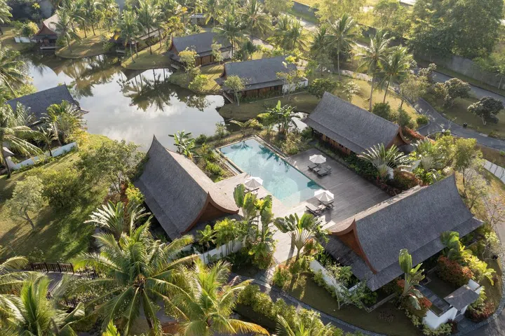 Aerial view of the three-bedroom Leelawadee Villa set within landscaped grounds remniscent of a traditional Thai village