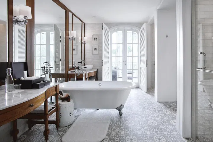 Behind the white or wooden facades, the aesthetic is restful, muted, and brimming with elegant touches, such as paintings, flowers, and ornate tiling in the bathrooms, which boasts another popular feature — a footed bathtub taking centrestage.