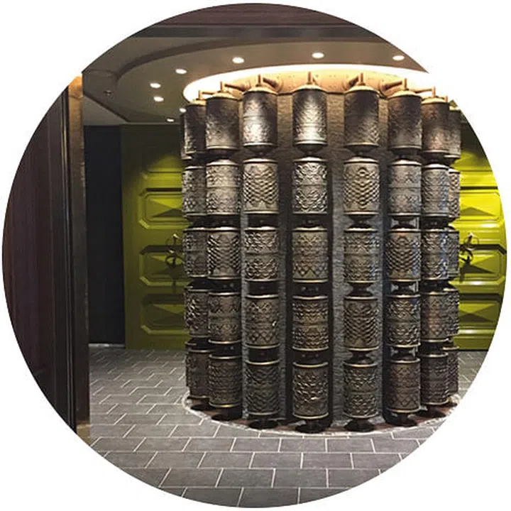 EASTERN TURN A bronze installation of Tibetan prayer wheels adorns the entrance of Pacific Rim.