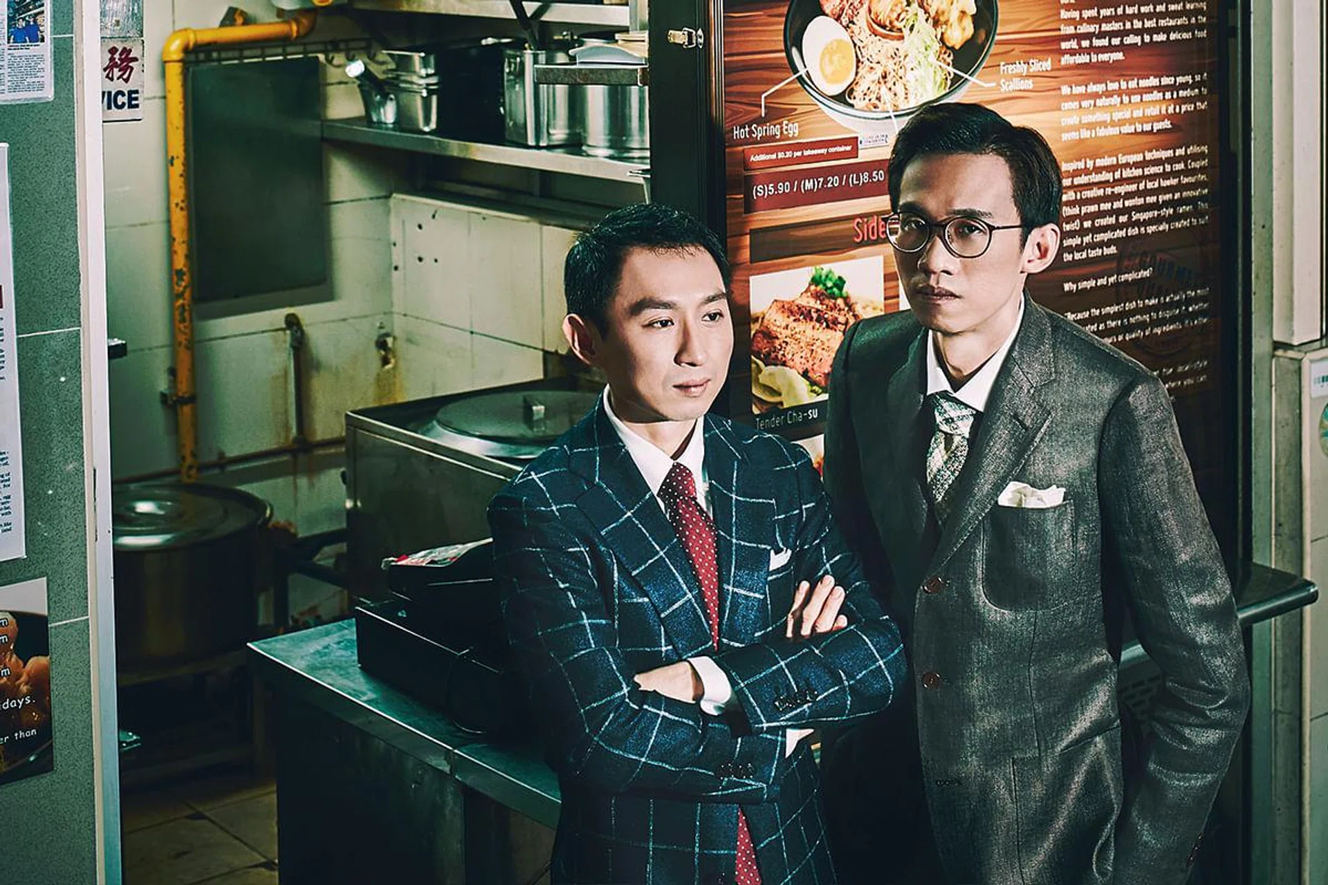 OUTFIT GWERN: Suit, from Suit Supply. Shirt, from Uniqlo. Tie, from Boggi. BEN: Jacket and shirt, from Sacoor Brothers. Trousers and tie, from Suit Supply.