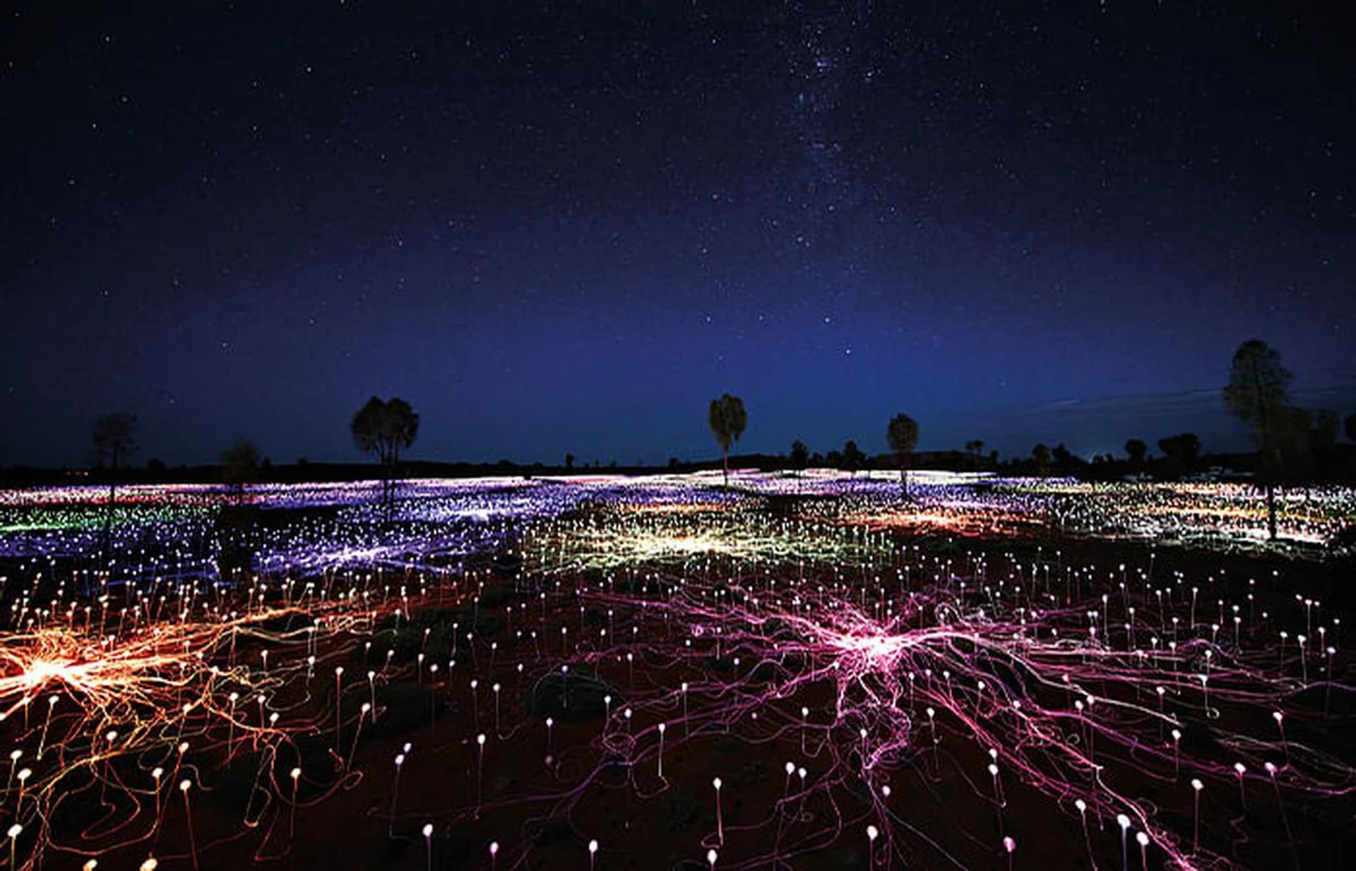 If, after sundown, you visit the UNESCO World Heritage site of Uluru—the red monolithic sandstone rock in the Northern Territory that’s one of Australia’s most famous landmarks—you’ll see a spectacle of 50,000 fantastical, fairy-like spindles of violet, blue, ochre, and white light spread out and swaying across a field.