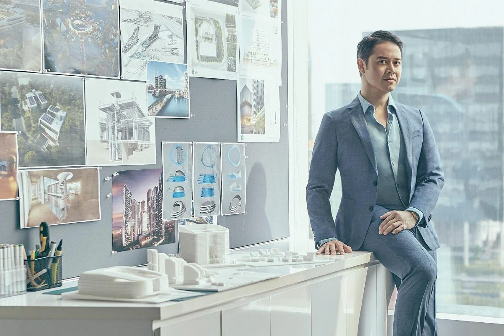 At 43, Pomeroy is the principal architect and founder of Pomeroy Studios, and a leader in sustainable architecture. Working across the world, he has devised projects that are ahead of their time, from a technological hub in Jakarta dubbed the “Silicon Valley of Indonesia”, to applying research in zero-carbon houses to create affordable housing in the Philippines. He’s also an academic, author, TV host, collector of objet d’art, and, as we discover, a bona fide fashionista, and a one-time purveyor of antique samurai swords.