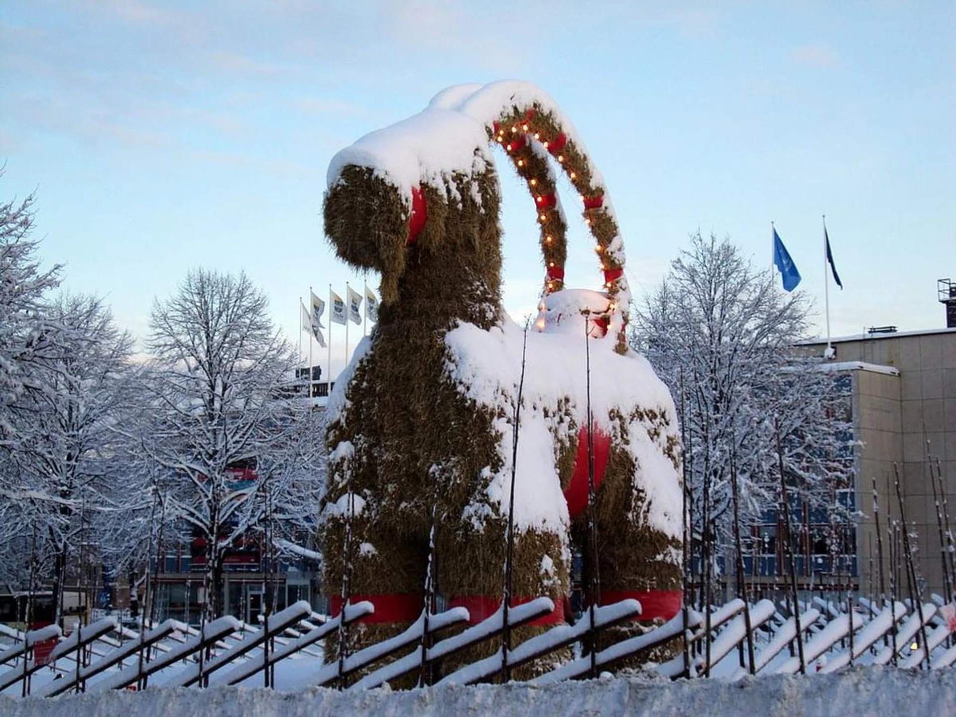 You see, the Gavlebocken isn’t meant to be burnt. The giant straw goat is a Christmas symbol that has been erected every year since 1966 by local community groups at the beginning of Advent.