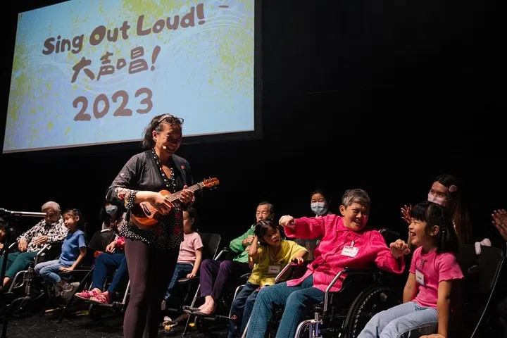 Seniors with mild stage dementia and pre-schoolers participating in Sing Out Loud!, an intergenerational programme developed by Esplanade in partnership with Dementia Singapore. (Photo: Alvin Ho, Courtesy of Esplanade – Theatres on the Bay)