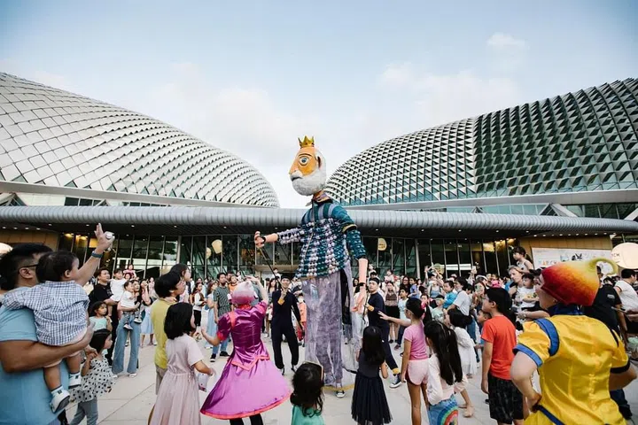 Families at the Esplanade Forecourt Garden enjoying Rattle King 2, a participative promenade performance commissioned by Esplanade for its children’s festival March On. (Photo: Esplanade – Theatres on the Bay)