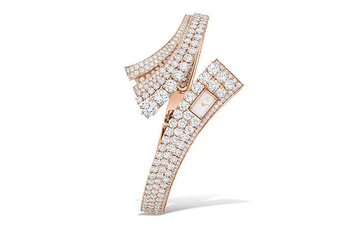 The 101 Bangle, Jaeger-LeCoultre’s new high jewellery timepiece featuring the Maison’s remarkable Calibre 101 is a stunning beauty. Weighing barely a gram, the minuscule hand-wound movement measures 14mm long and less than 5mm wide (it’s the world’s smallest mechanical movement). Here, it takes centre stage on an elegant bangle of graduating diamonds and gold.