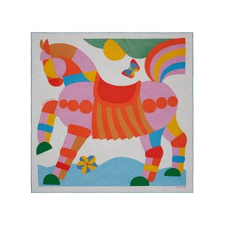 Hermes unveiled the theme of its Spring/Summer 2023 Objects collection as ‘Astonishment’ and it’s perfectly illustrated in this silk shawl with its whimsical horse print.