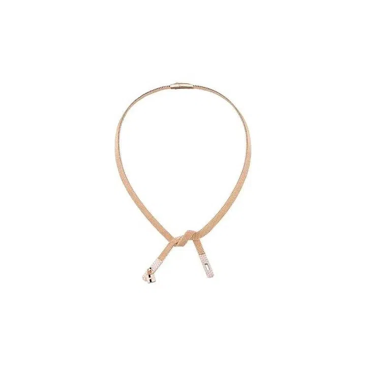 Designed by Hermes’ creative director of jewellery, Pierre Hardy, the Kellymorphose line is a celebration of the Kelly bag and its most recognizable motif: the clasp. The Kelly Gavroche necklace is an interpretation of the Kelly bag’s strap, with the form inspired by the fluid movement of the scarves Hermes is renowned for.