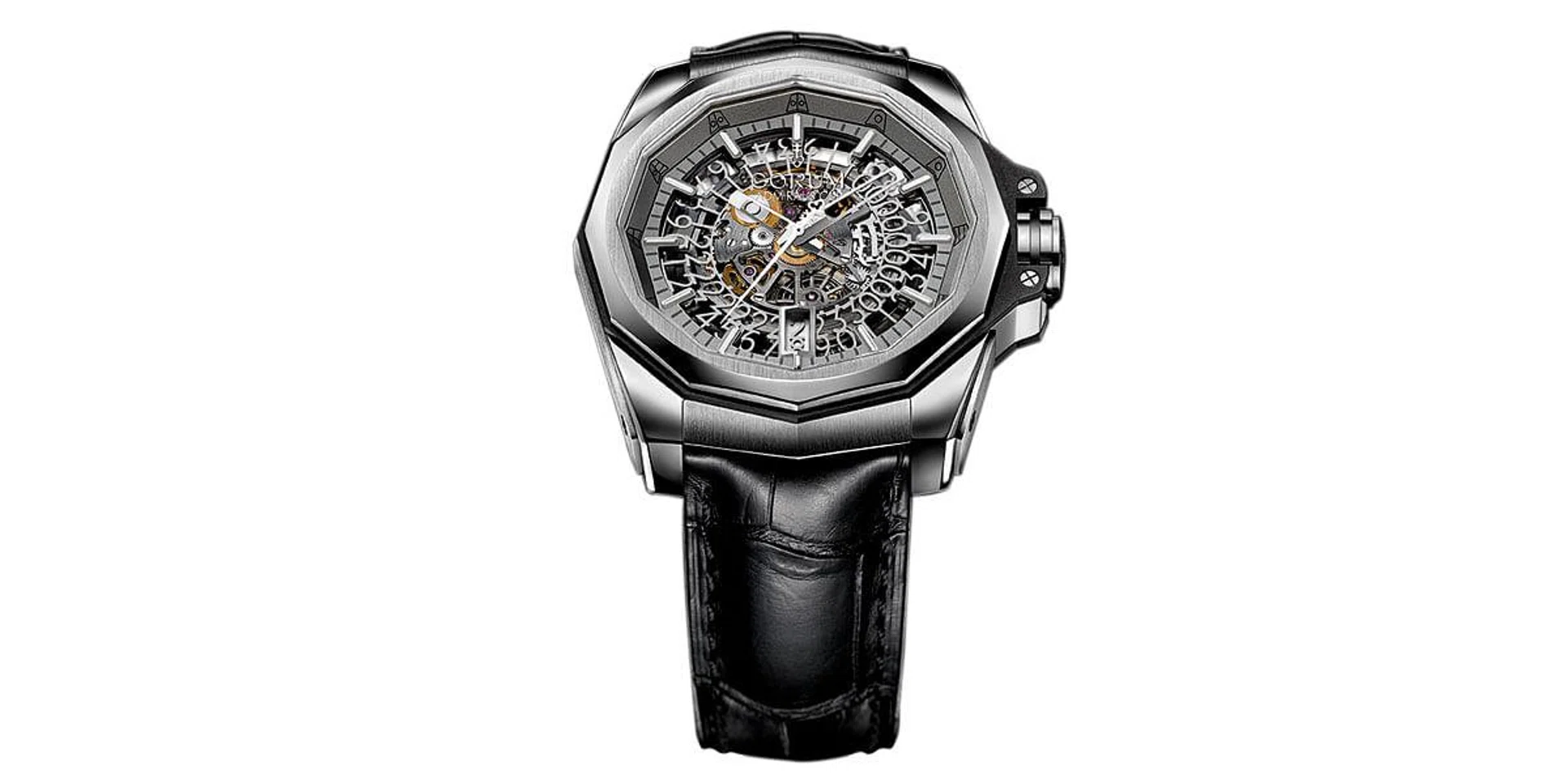 Don’t be overwhelmed by Corum’s Admiral’s Cup AC-One 45 Squelette. Impressively complicated as the dial may be, it’s still a simple enough three-hand model with date. It is in fact the dates that give this imposing 45mm watch such a mesmerising face. The entire rotating date disc has been skeletonised to show off each individual number, with the present date aligning vertically at a window at six o’clock. It’s still a classic Admiral’s Cup however, with its 12-sided case, nautical pennants and Corum key-shaped seconds hand. The automatic CO 082 movement beats at 4Hz and comes with a 42-hour power reserve. Corum’s Admiral’s Cup AC-One 45 Squelette