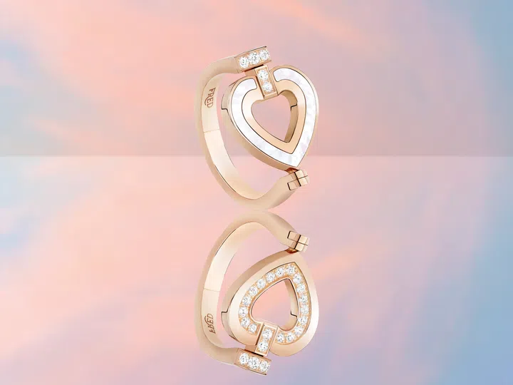 The necklace showcases two movable hearts connected by a detachable diamond-and-gold pave clasp. One heart is adorned with mother-of-pearl, while the other shimmers with diamonds. Both hearts are reversible to allow for four different style combinations. The ring mirrors this playful spirit by way of a double-heart design that is reversible in a single motion. One side displays mother-of-pearl and gold; the other pink gold and diamonds.