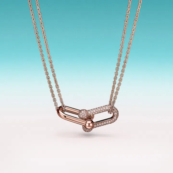 Featured here is the HardWear by Tiffany double-link pendant in rose gold with pave diamonds, in size large. It is eye-catching and versatile, with the interlocking links almost forming a heart shape — what’s not to like?