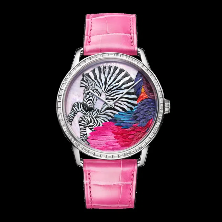 Among them are the Arceau Marqueterie de Paille and Slim d’Hermes La Source de Pegase watches, which are realised through straw marquetry. Showcasing silk thread marquetry are the Arceau Mon Premier Galop and Arceau Toucan de Paradis. The Slim d’Hermes Zebra Pegasus creation flaunts a composition that puts pride of place on feather marquetry.