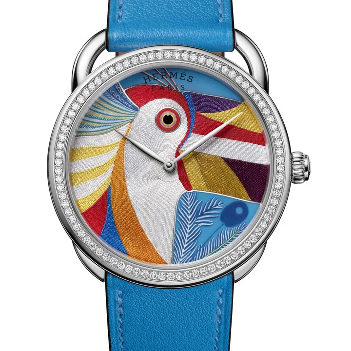 Since silk scarves are an intrinsic part of Hermes’ long heritage, Paul-Depasse had wanted to showcase the material on a dial. After witnessing how the threads were used in kimono-making, she took nearly four years to bring them to life on a toucan motif.